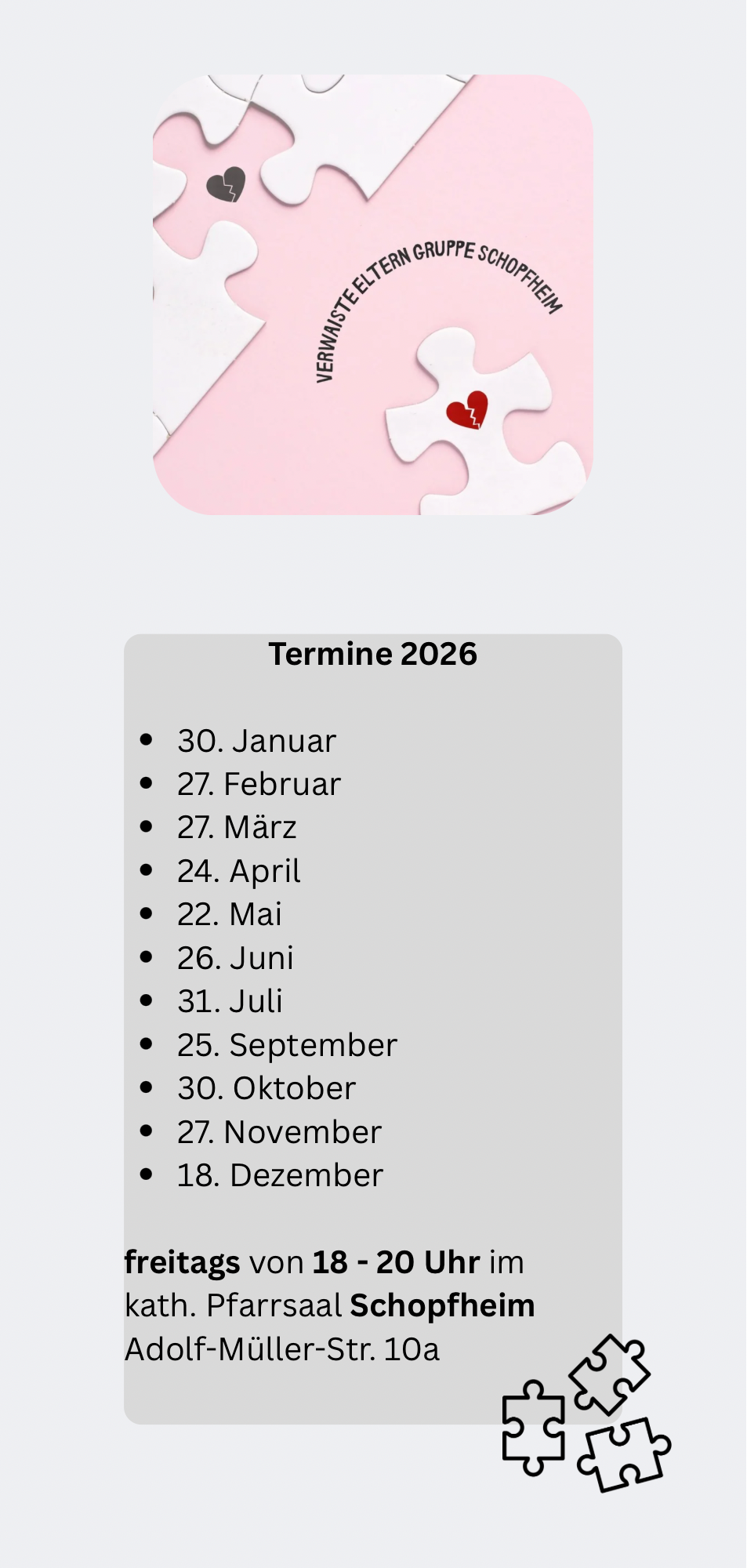 Wann 27.02.26 18:00 - 20:00 Zum Kalender hinzufügen ICS herunterladen Google Kalender iCalendar Office 365 Outlook Live Wo Pfarrsaal Schopfheim Adolf-Müller-Straße 10a, Schopfheim, 79650 Veranstaltungstyp Angebote für trauernde Eltern Nächstes Gruppentreffen am 27. Februar 2026 um 18 Uhr im kath. Pfarrsaal in Schopfheim Verwaiste Eltern Schopfheim