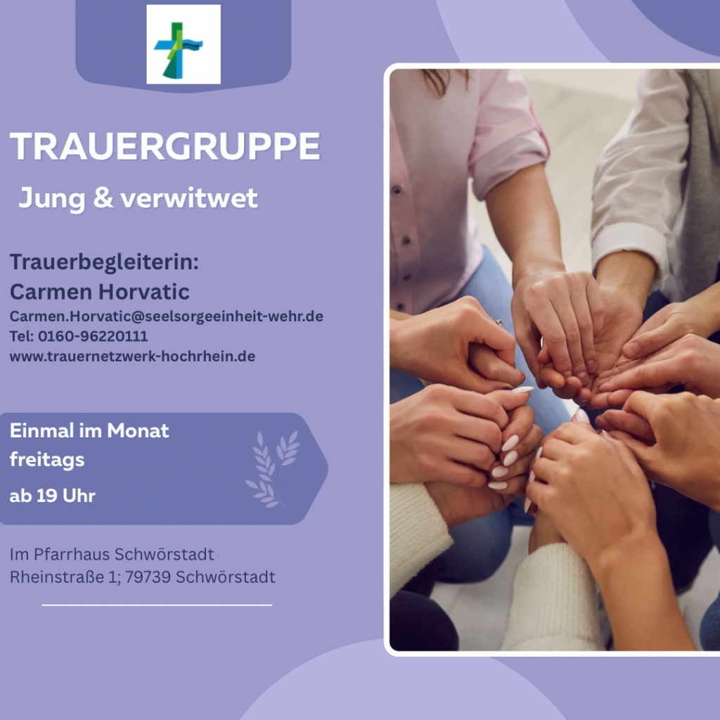 Sie richtet sich an jung verwitwete Menschen, die ihren Partner in einer frühen Lebensphase verloren haben (bis ca.50 J.). Der Verlust eines Partners/Patnerin verändert das Leben ratikal. Gibt es gemeinsame Kinder, kommen neben der eigenen Trauer noch vielfältige, teilweise existentielle Herausforderungen hinzu. Für alle diese Themen bietet die Trauergruppe einen geschützten Ort, Impulse und die Möglichkeit zum gegenseitigen Austausch.Die Trauergruppe trifft sich monatlich immer freitags um 19 Uhr im Pfarrhaus Schwörstadt. Weitere Informationen und einen Erstkontakt finden Sie bei Carmen Horvatic, Trauerbegleiterin unter: 0160-96220111